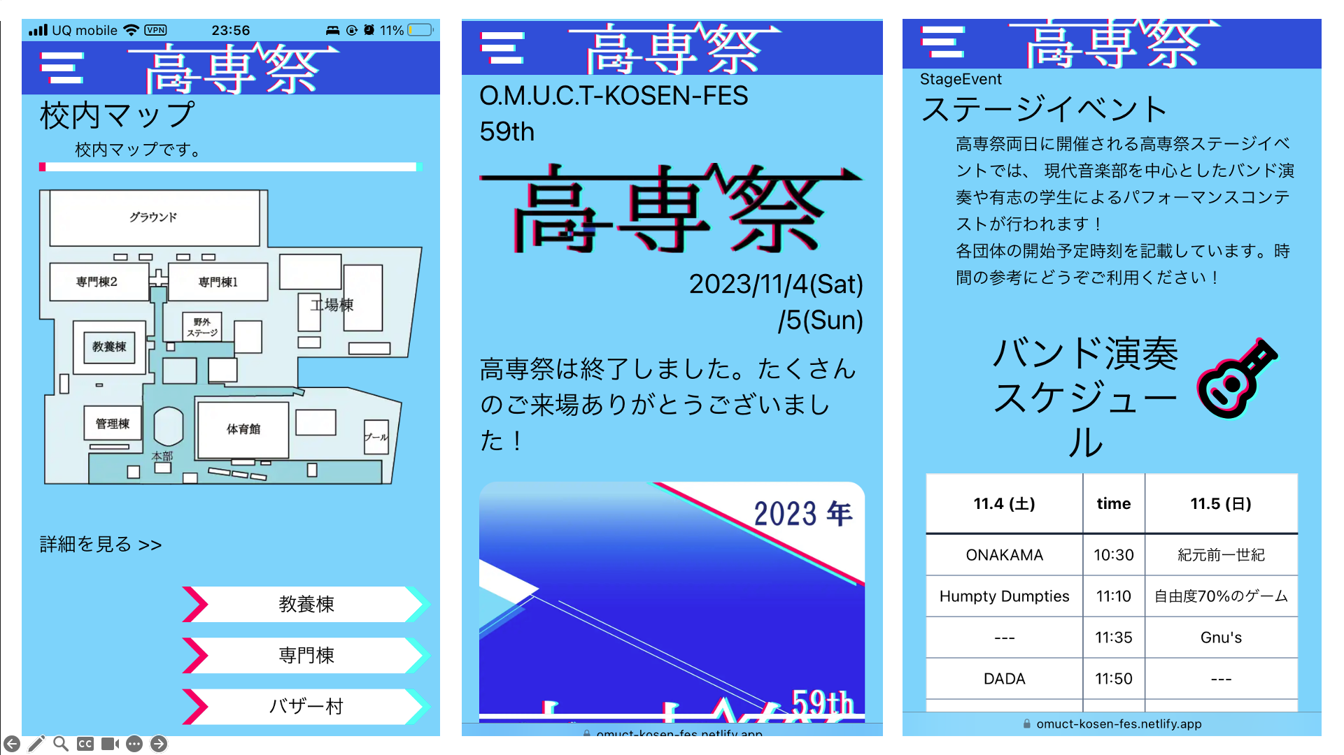 昨年に引き続き、高専祭特設サイトをデザイン・コーディングを行いました。React、GatsbyJSベースで作成し、Netlifyでデプロイしました。また、TailwindCSSを使用しました。