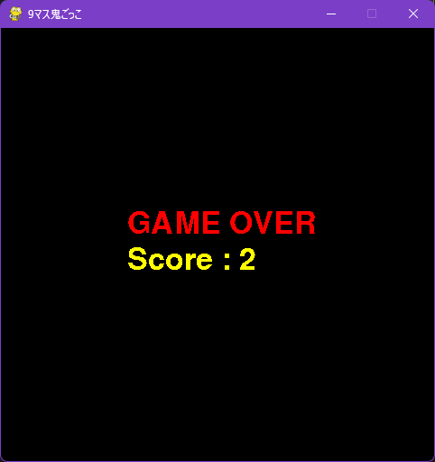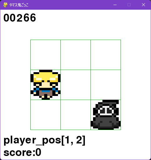 1年間のpythonの集大成として9マス鬼ごっこというゲームを作成しました。9マス鬼ごっことは9マスの中にプレイヤーと鬼が配置され、それぞれ同時に別のマスまたは、今いるますにとどまり、プレイヤーと鬼が同じマスになったときにゲームオーバーとなるゲームです。このゲームではプレイヤー側をキーボードを使って操作します。鬼はキーボード操作後にランダムで移動します。また、移動できた回数により、スコアが加算されていきます。