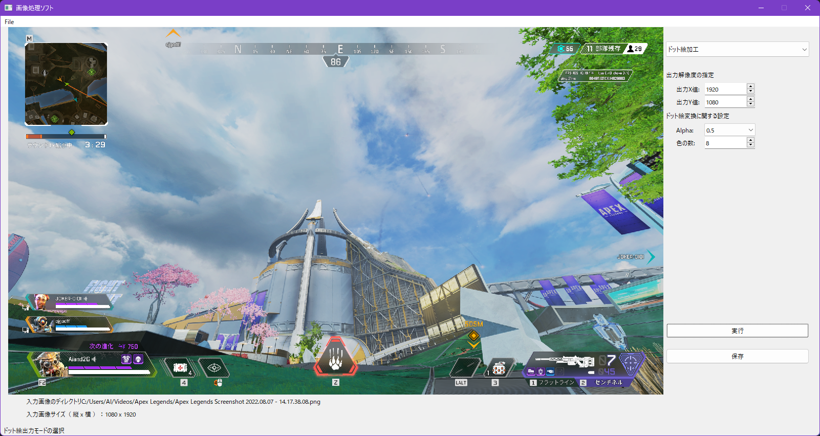 PySide6を利用して画像エフェクトアプリを作りました。このアプリは任意の画像を入力し、ドット絵風処理をすることができます。また、その出力を画像ファイルに保存することができます。ドット絵処理にはK-means法を用いて減算処理を行っており、画像領域内の色の比率によって指定する色の数に減算処理をすることができます。また、Alpha値の指定ができ、ドット絵処理のドット数を指定することができます。画像処理にはOpenCVを用いて作成しました。